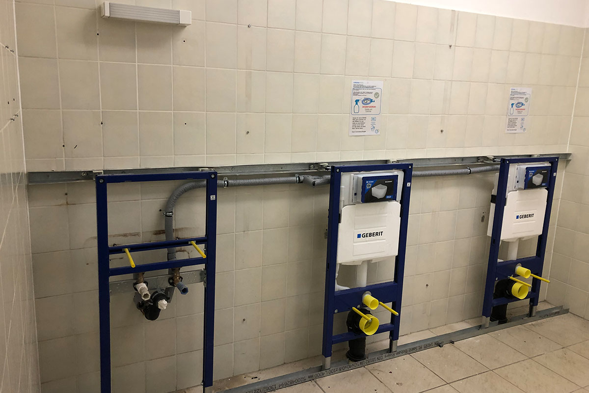 Zunächst werden die Damen- und Herrentoiletten neugestaltet. Nach der Fertigstellung erfolgen die Toilettenanlagen in den Damen- und Herrenumkleiden.